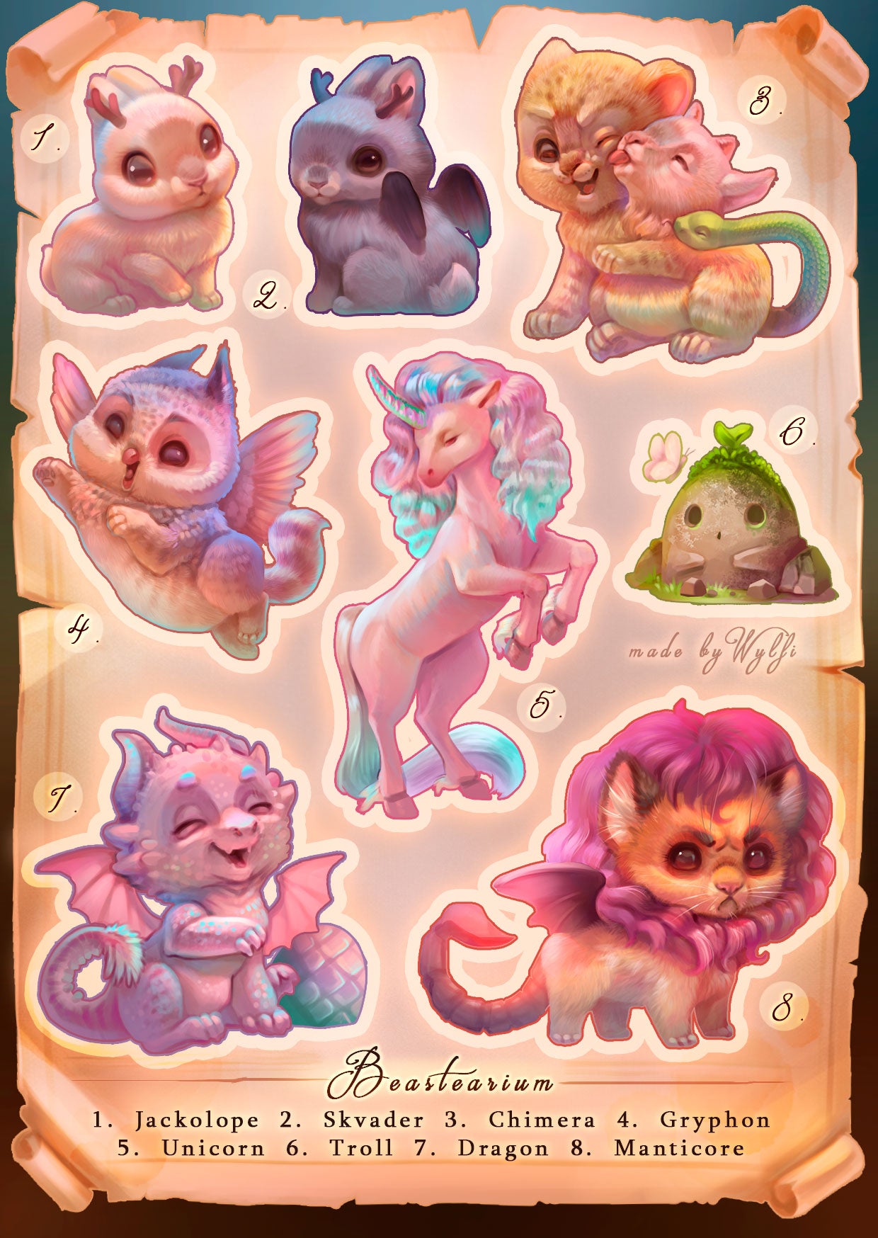 Here is a page from the old Encyclopedia of magical creatures. Look who we got here! Little cute jackolope and his little brother skvader, deadly manticora and gorgeous unicorn, and many more!